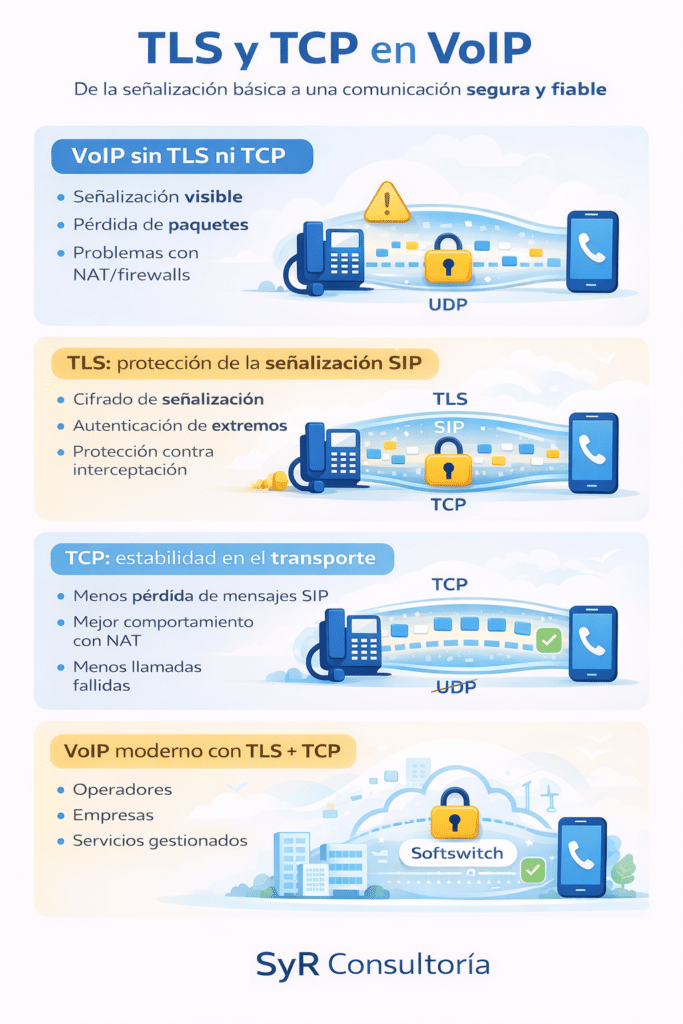 Es decir, TLS y TCP para VoIP no solo aumentan la seguridad, sino también la robustez del servicio frente a entornos hostiles o redes con NAT/firewalls complejos.