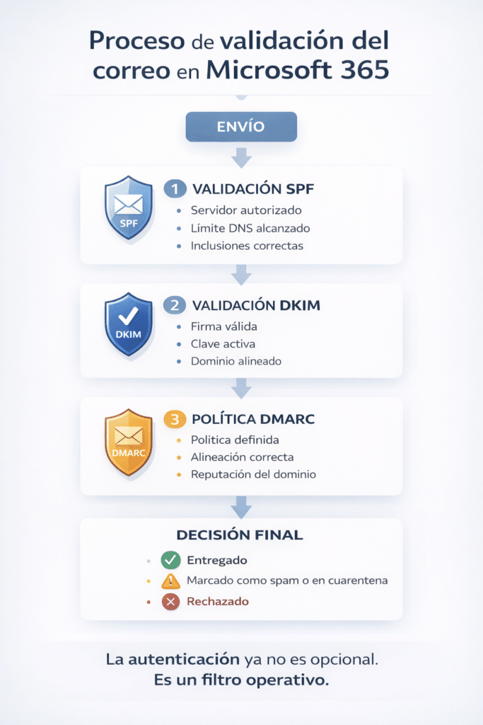 No basta con que existan registros en DNS. Microsoft evalúa que estén bien construidos, que incluyan todos los sistemas de envío y que exista coherencia entre el dominio visible y el autenticado.